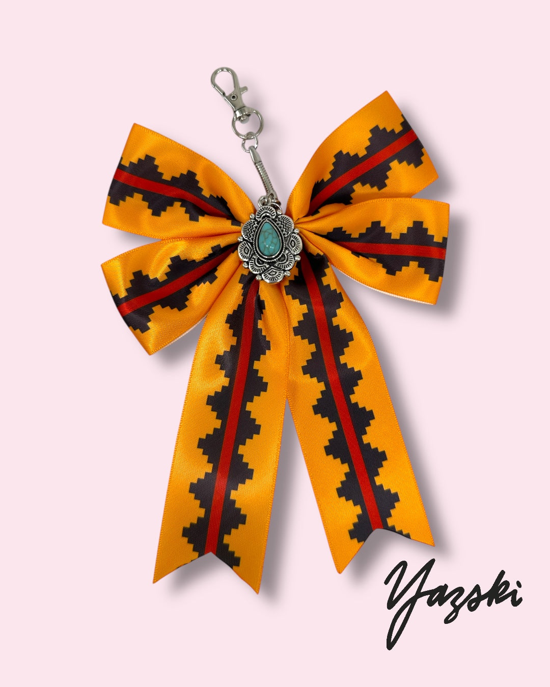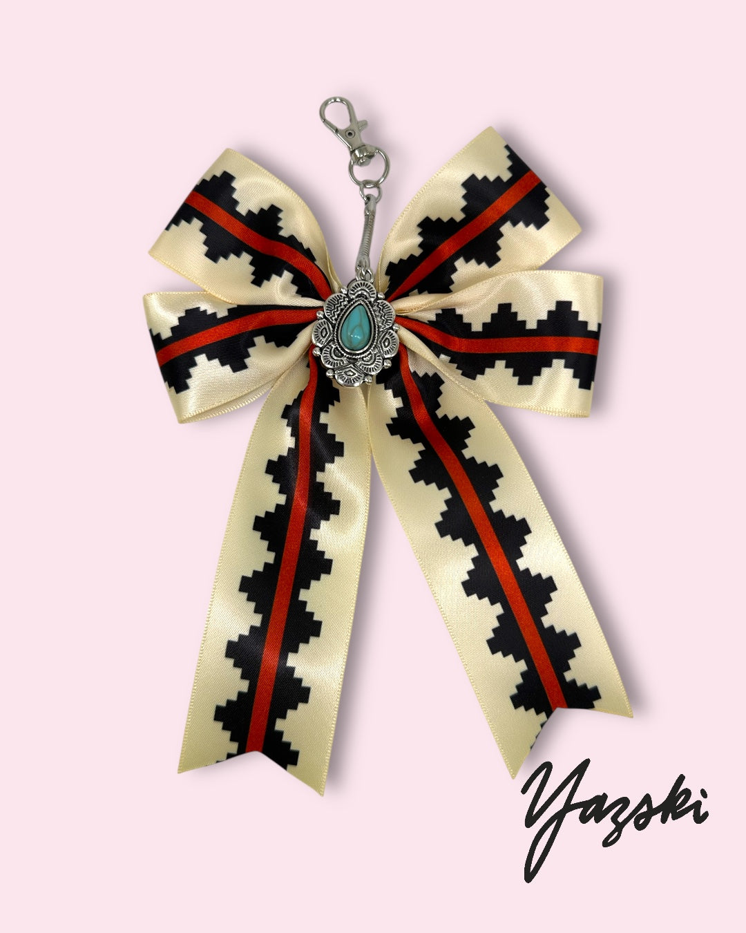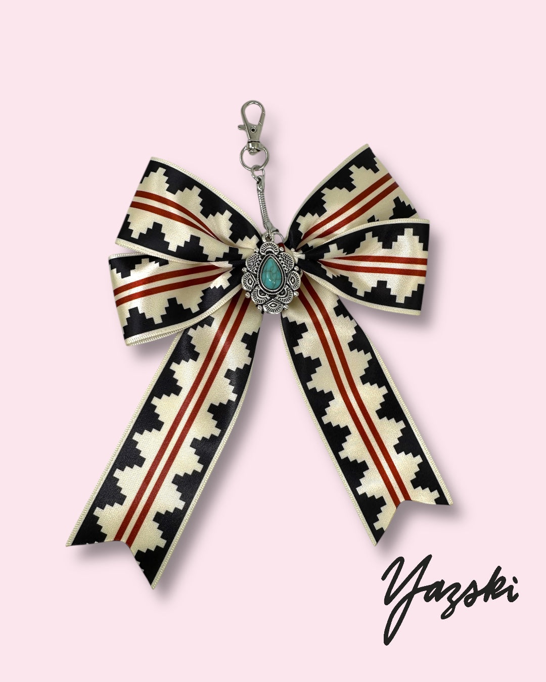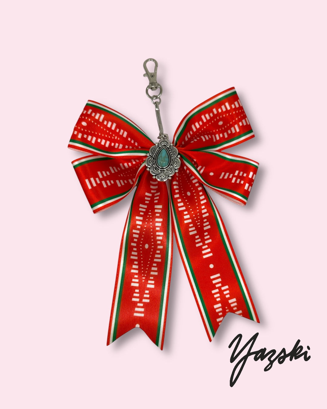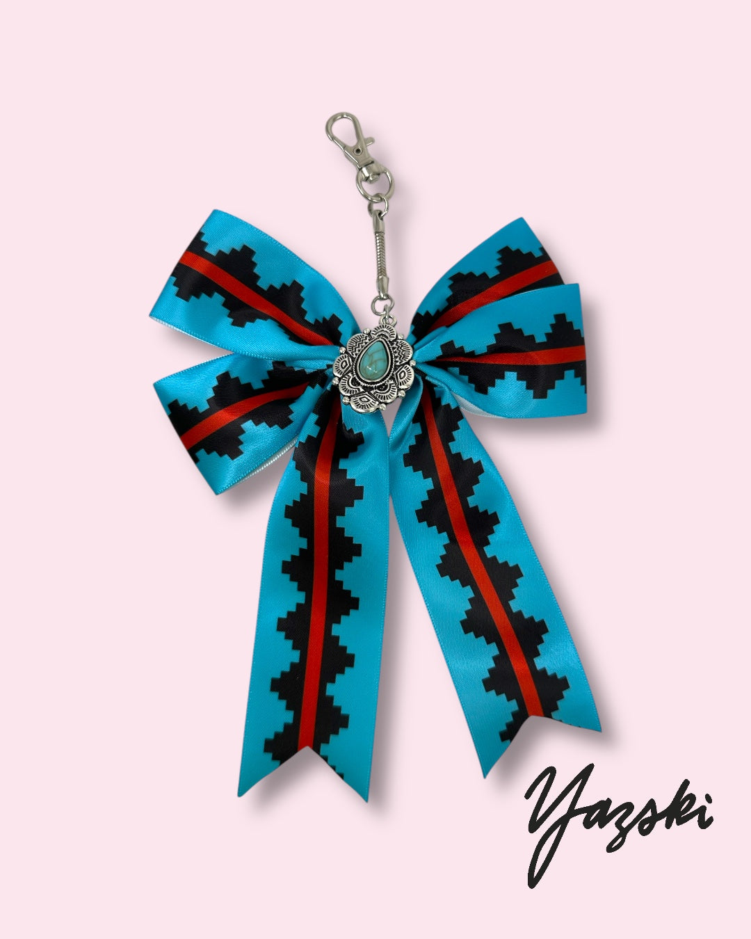 Bow charm is made with poly satin fabric and a faux turquoise charm.