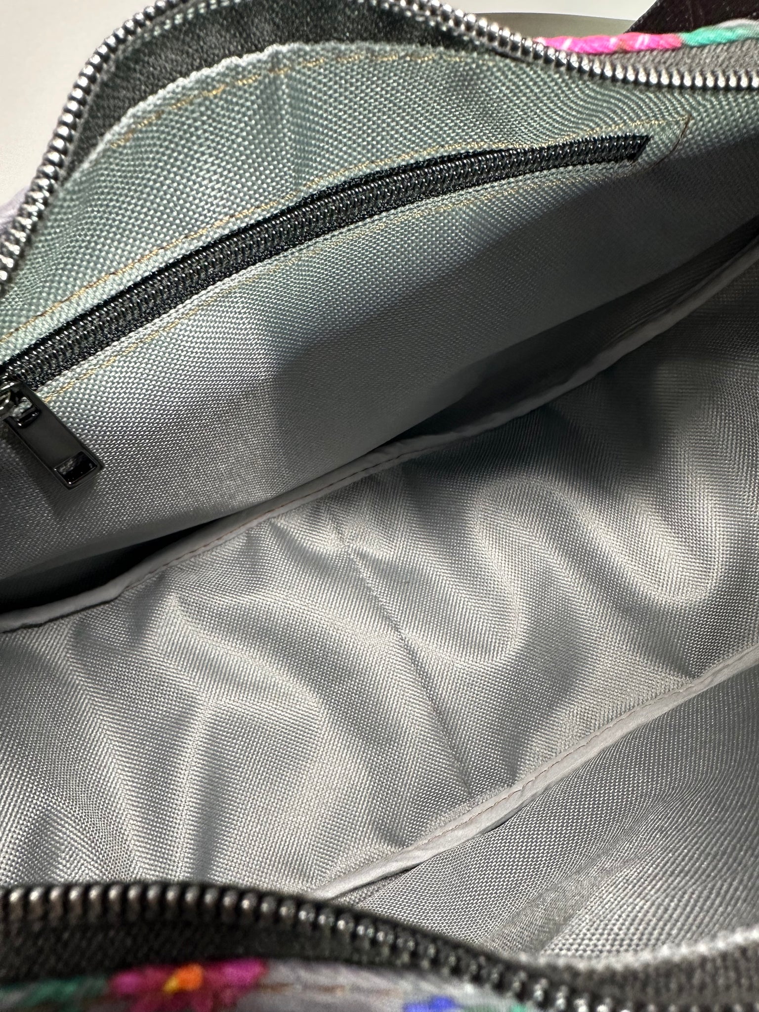 Interior features one small zipper pocket.